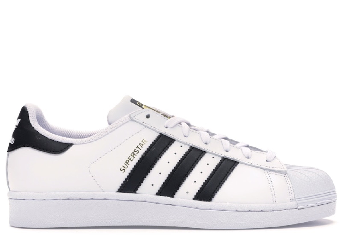 Run-DMC's 1969 basketball shoe. The shell toe. White leather, black three-stripes, the most copied silhouette in sneaker history. Hip-hop adopted it in the 80s, fashion adopted it in the 2010s, your dad has worn the same pair since 1992.