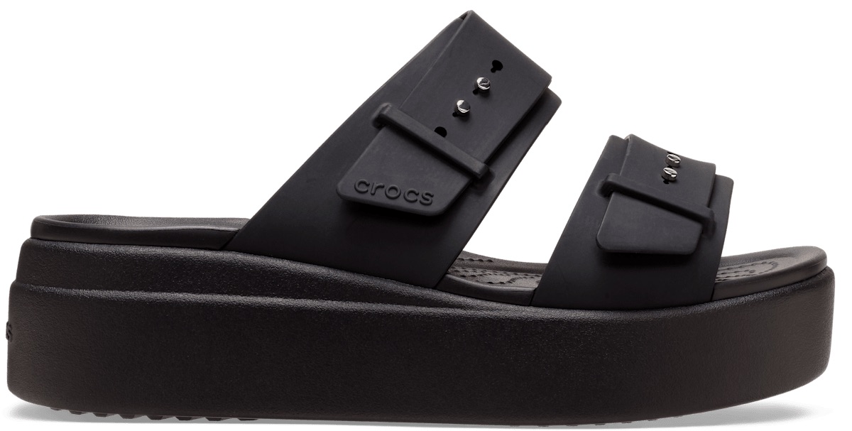 Brooklyn — the dressed-up Crocs. Two slim Croslite straps, brass-look buckle, low wedge. The pair that lets a girlfriend get away with Crocs to a beach-club dinner without anyone clocking them as Crocs.