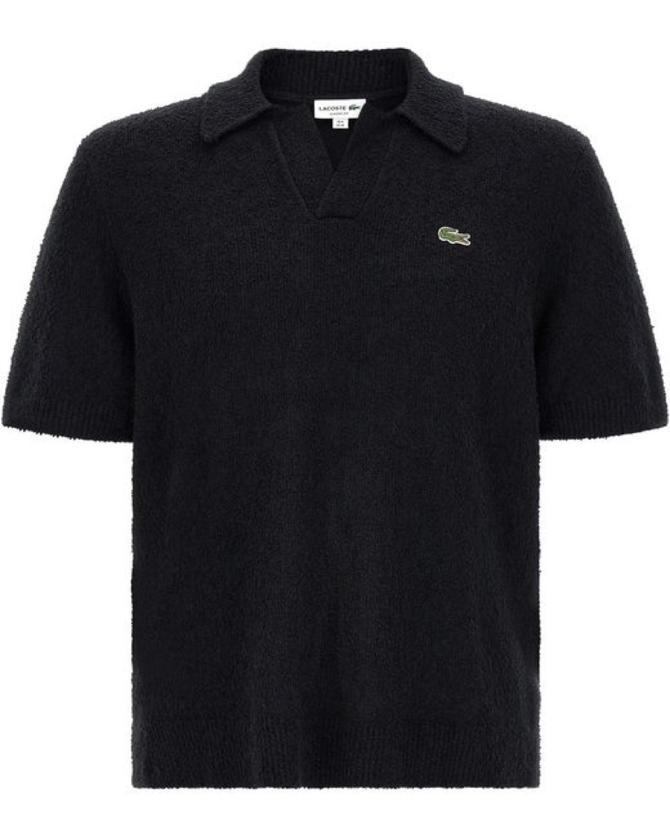 Boucle in black. The dressiest polo Lacoste makes — works as the top half of a smart-casual look at any restaurant on the island. Holds shape, drapes well, reads expensive.