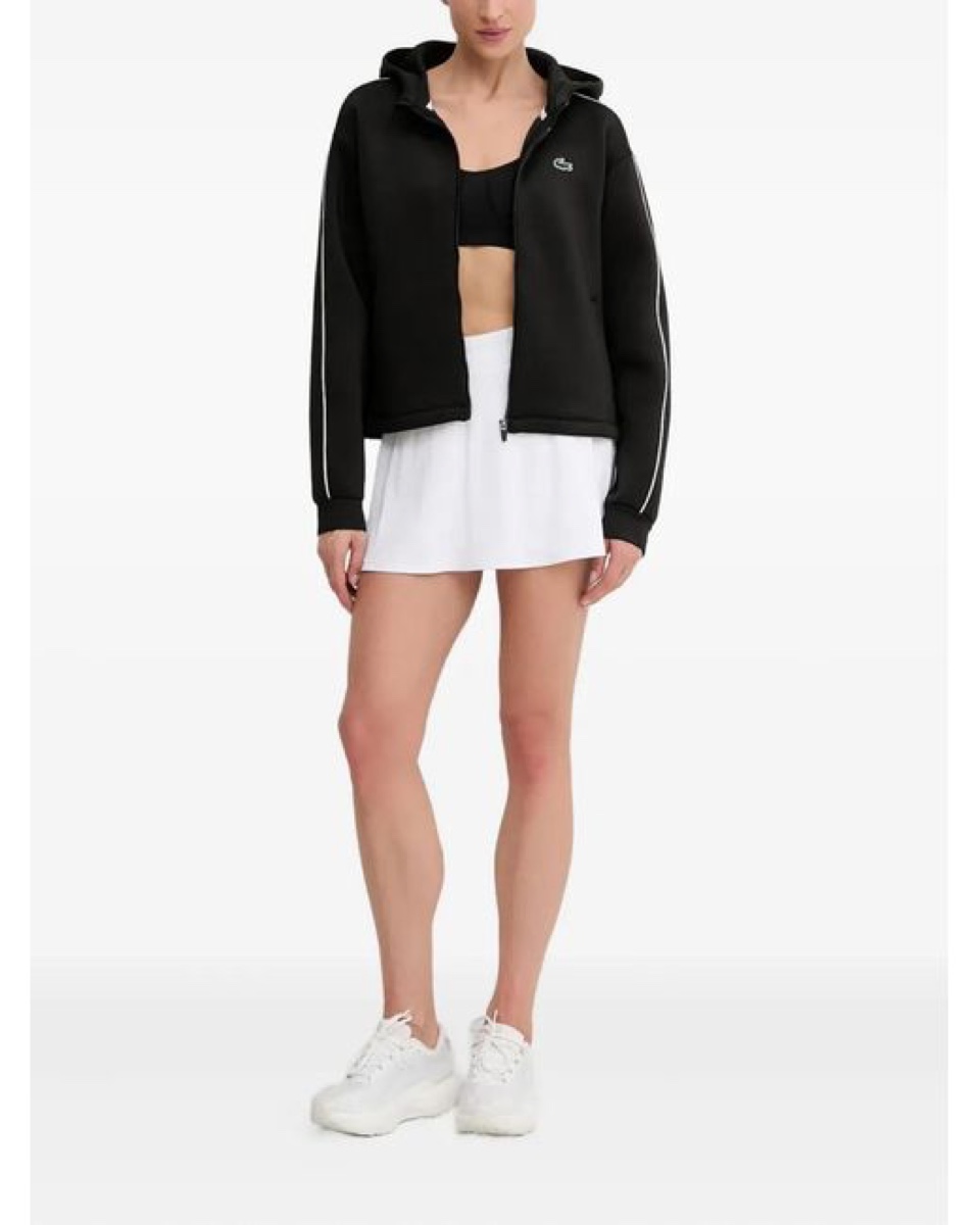 Black track jacket with contrast taping down the sleeves and the embroidered crocodile. Resort-club layer, scooter ride layer, plane layer. The most-packed piece in the Lacoste outerwear lineup.