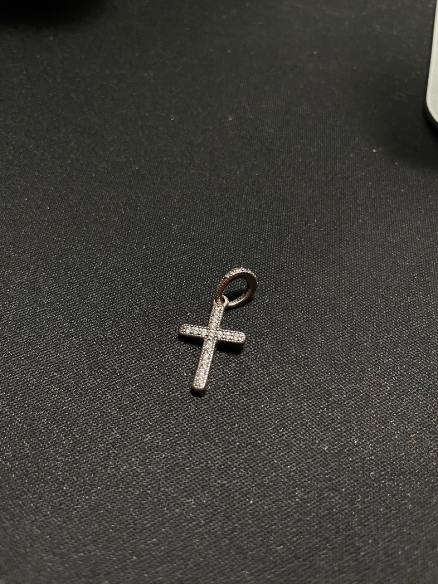 A petite pavé cross pendant in sterling silver with cubic zirconia, threads onto any Pandora chain. Faith-rooted, popular with Filipino, Latin and Italian customers vacationing in Bali — strong gift-set energy.